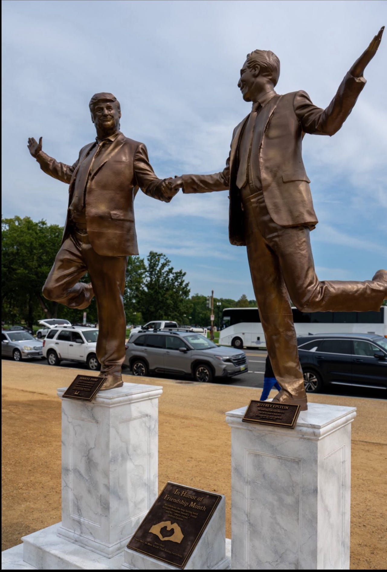 And then there’s the statue. A piece of protest art of him and Epstein was set up outside the Capitol as a reminder that the Epstein files aren’t going away. My sources say Trump was fuming about it, demanding it be taken down before he got back to the White House. That tells you everything. He can try to bury the truth, but the truth keeps showing up — in stone, in headlines, and in the streets.