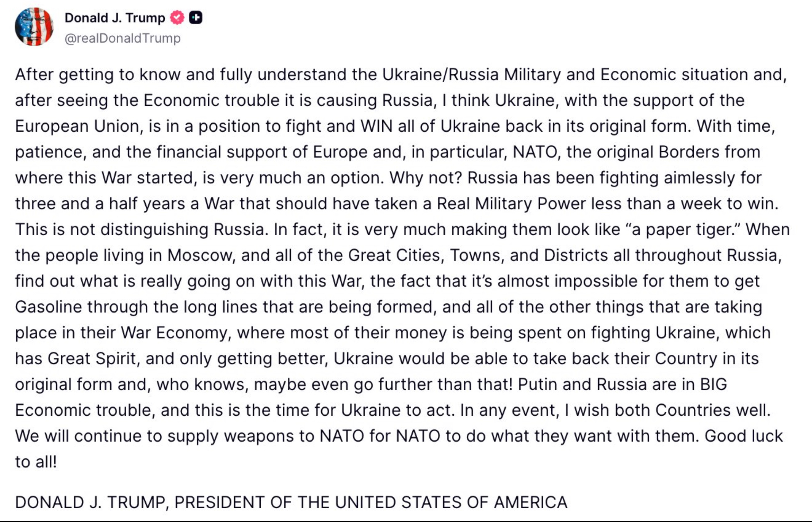 If you didn’t think it could get any more obvious, then came Trump’s Truth Social post. In it, he wished both countries good luck. Think about that. One country is the aggressor, bombing civilians, tearing children from their families. The other is fighting for its very survival, its independence, its democracy. And he lumps them together with a casual “good luck.”