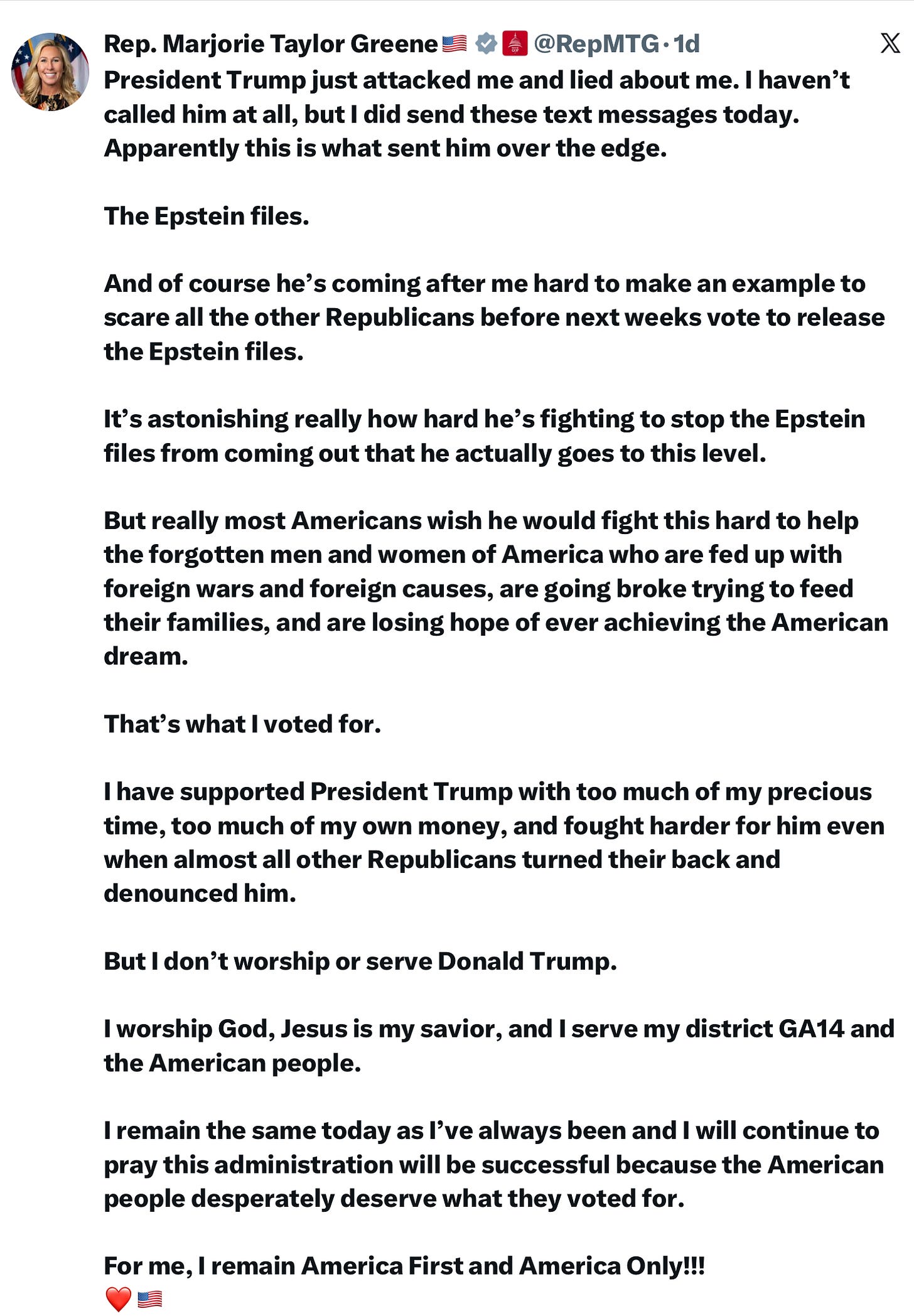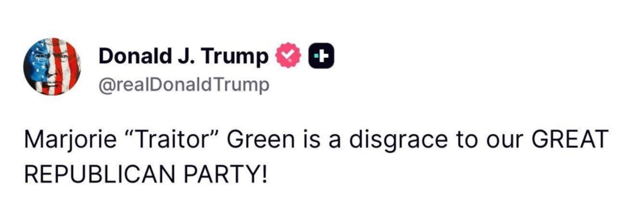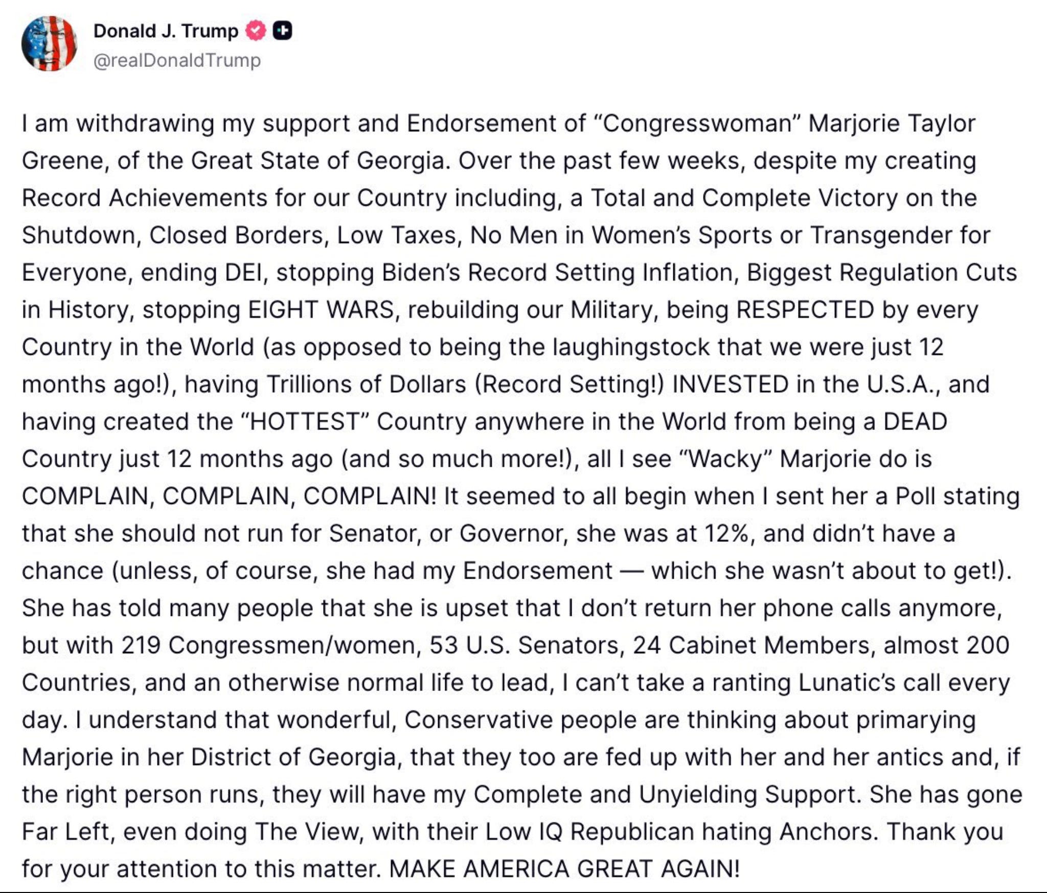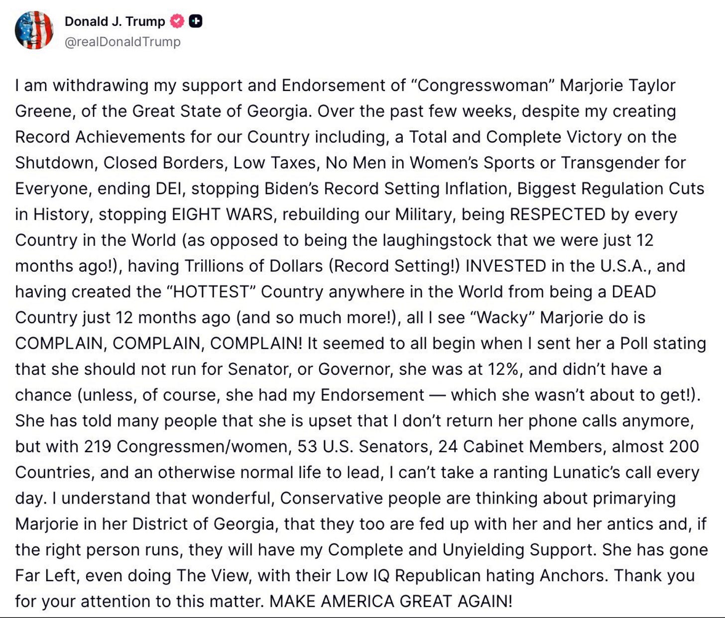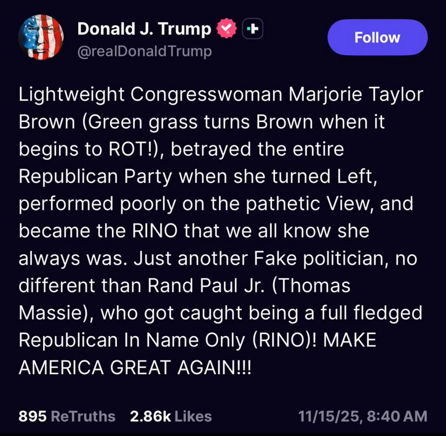 Yes, the same Marjorie who used to be his “future star,” the same one he boosted, defended, and used as one of his loudest attack dogs. Now, after she’s criticized efforts to block the release of Epstein documents and pushed back on some of his foreign policy positions, he’s branding her a traitor and testing out insults like “Wacky Marjorie.”