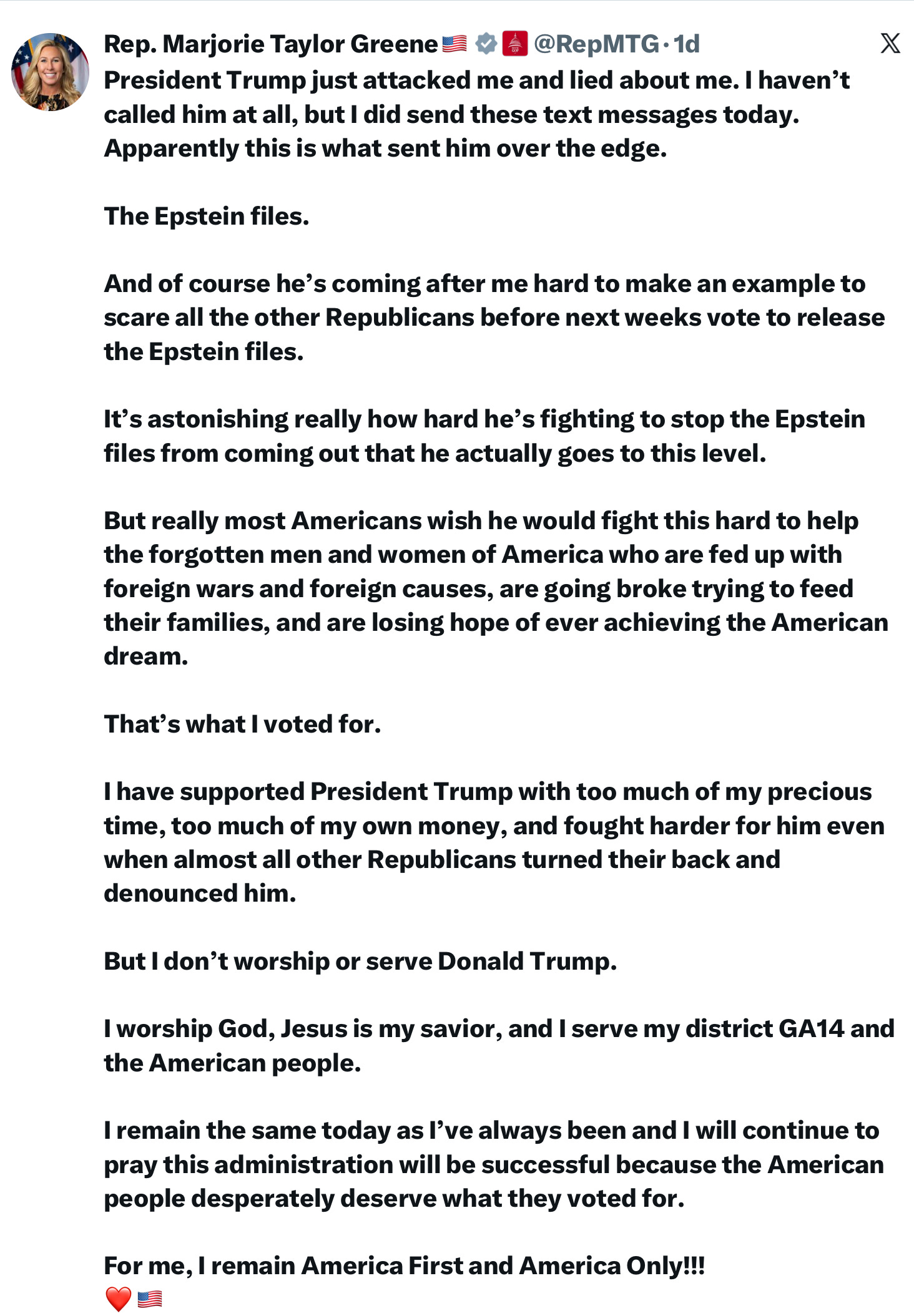 Instead of isolating Greene, it’s exposing Trump’s desperation. More Republicans — especially the ones who can read polling and see what’s coming in 2026 and 2028 — are starting to question whether tying themselves to his cover-ups and his Putin worship is a good long-term plan.